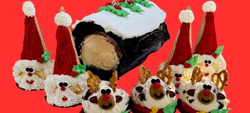 Savor our bunny rolls—opt for white or chocolate cake enveloped in a layer of delightful ice cream. Each one is elegantly finished with a topping of either whipped frosting or luscious fudge.